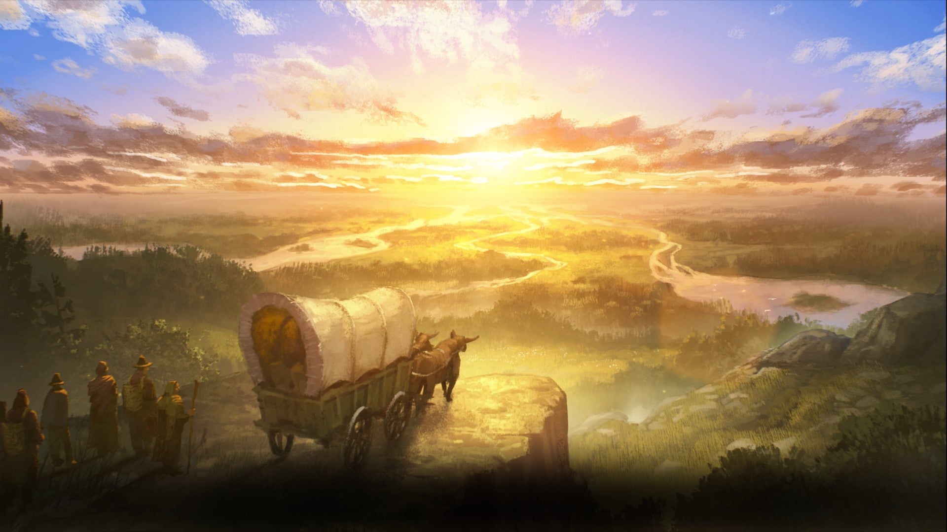 It’s a game about a group of working class people fed up with being shat on by the rich, in the big city where they live, so they strike out for the literal farthest frontier to make it on their own. It’s that fantasy. The era is the birth of the Industrial Revolution, maybe – it’s not explicitly clear. And that’s how it begins: a dozen people and a caravan and an endless wilderness around them to tame.
